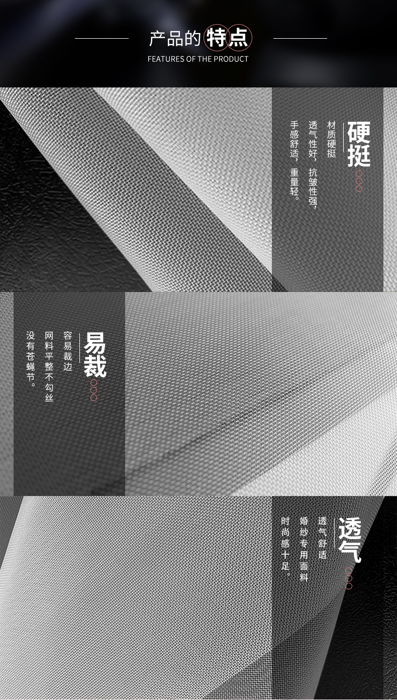 臺(tái)州金玨網(wǎng)布,專(zhuān)業(yè)從事各種規(guī)格材質(zhì)的網(wǎng)眼布,主要應(yīng)用在婚紗禮服、箱包、鞋帽、過(guò)濾、家居裝飾等行業(yè)領(lǐng)域上。可來(lái)圖來(lái)樣進(jìn)行定制,免費(fèi)寄樣,材質(zhì)硬挺、網(wǎng)孔均勻、目數(shù)精準(zhǔn),耐高溫、不縮水不變形等優(yōu)點(diǎn),43年網(wǎng)布生產(chǎn)經(jīng)驗(yàn),貨源穩(wěn)定、獲得新老客戶(hù)一致好評(píng) 如果你是采購(gòu)商、貿(mào)易商或者加工廠請(qǐng)聯(lián)系我們吧!