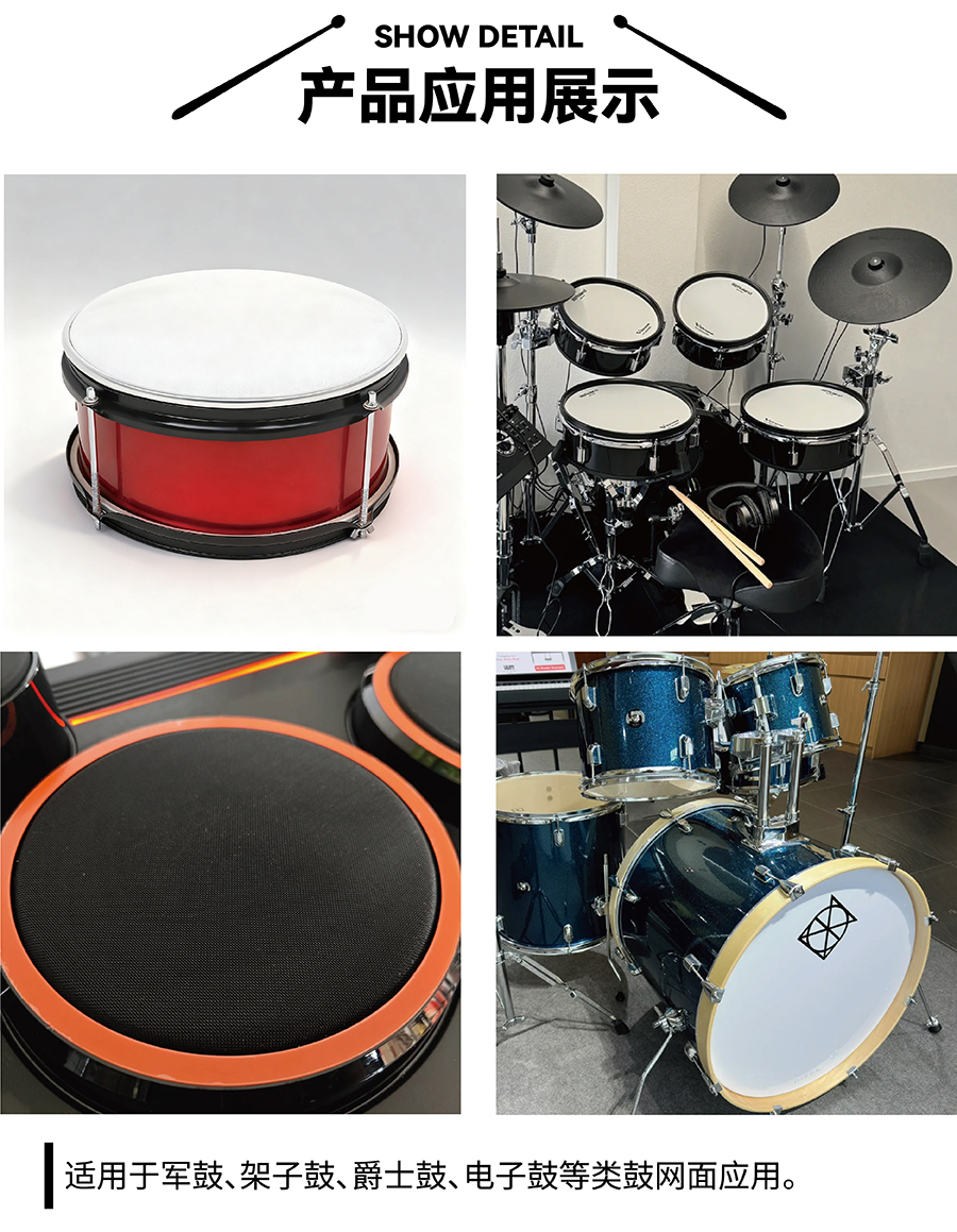 鼓皮絲網(wǎng)是覆蓋于鼓皮表面或鼓腔外側(cè)的防護(hù)與聲學(xué)輔助配件,主要采用尼龍、聚酯或特殊化纖材質(zhì)經(jīng)精密編織制成,核心定位是 “保護(hù)鼓皮 + 優(yōu)化聲學(xué)表現(xiàn)”,尤其以硬挺質(zhì)感為核心優(yōu)勢(shì),適配架子鼓、非洲鼓、手鼓等多種鼓類樂(lè)器。